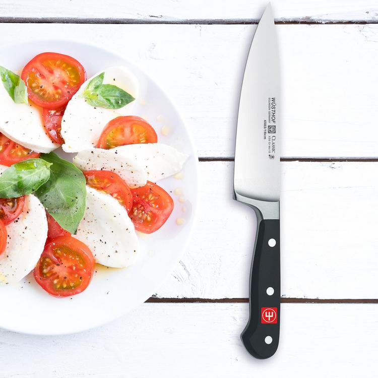 31+ Wusthof Tomato Knife Classic. The classic tomato knife has a serrated edge that enables the blade to slice through tomatoes without damaging the delicate fruit inside. Classic tomato knife slices even the ripest tomato as thinly as desired, and the forked tip makes short work of coring.