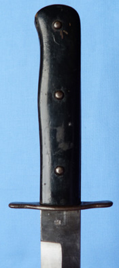 The handle has oak pieces on either side of the tang, which is held together by three metal screws.