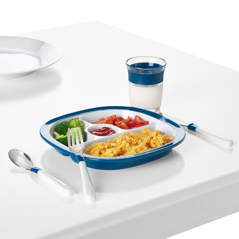 Coordinates with oxo tot bowl, plate and cup for big kids.
